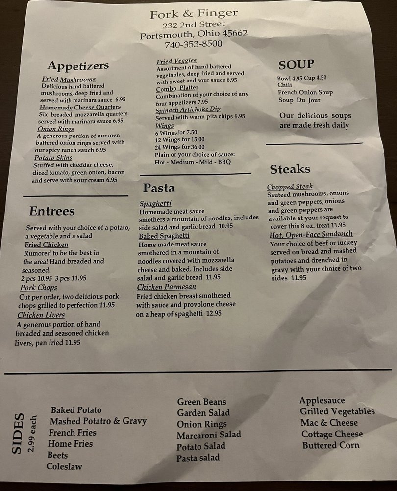 Welcome to Fork And Finger Restaurant, a charming establishment nestled in Portsmouth, OH. With an inviting American menu, this restaurant has quickly become a beloved spot for locals and visitors alike.